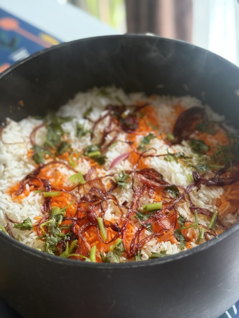 • Sprinkle half the reserved fried onions, saffron milk (if using), mint, coriander, and a drizzle of ghee.