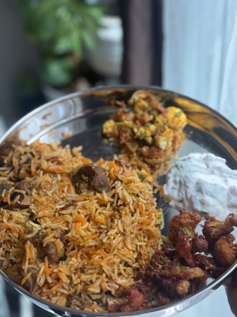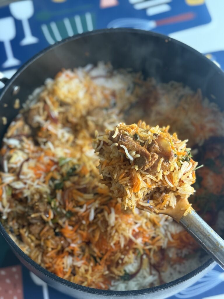 There’s something undeniably regal about a good mutton biryani. With each bite, you get melt-in-the-mouth meat, long grains of perfectly cooked rice, and a complex blend of spices that linger warmly. This version is a pakki-style biryani — meaning the meat is cooked first and then layered with rice for final steaming (dum).