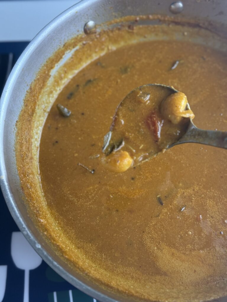 In Tamil households, kuzhambu is a staple — a tamarind-based curry often built on a base of tomatoes, garlic, and spices. This version adds a roasted masala twist: blending tomatoes, roasted chana dal, cumin, coconut, and whole spices into a smooth, rich base. It gives the kuzhambu a satisfying thickness and a layer of deep, toasty flavor without adding dairy or cream.